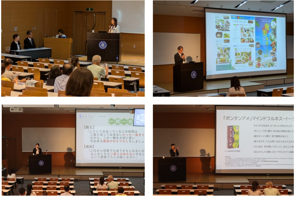 講座2ではSHIROYAMA HOTEL kagoshima イタリアン/リストランテホルト 副店長の木下綾氏より「日本が世界に誇るおもてなしについて」とのタイトルでお話をしていただきました。講演では「サービスとは何か」「ホスピタリティとは何か」「おもてなしとは何か」と問いかけた後、それぞれの概念が異なることについて丁寧に説明されました。そして、“お客様への心遣い”において最も高いレベルと位置付ける「おもてなし」とは、まだ見ぬ相手に対して到着する前から最高のひと時を提供するための準備と行動を指し、「AIの時代においても、おもてなしの心で自発的に行動できるのは我々人間だけ」と強調されました。最後に、ホテルが提供できるウェルビーイングについては、「美しき非日常、おもてなしという無形のものを提供することで、旅の思い出や笑顔、リラックス、リフレッシュできる場所を提供すること」として講演を締めくくられました。
