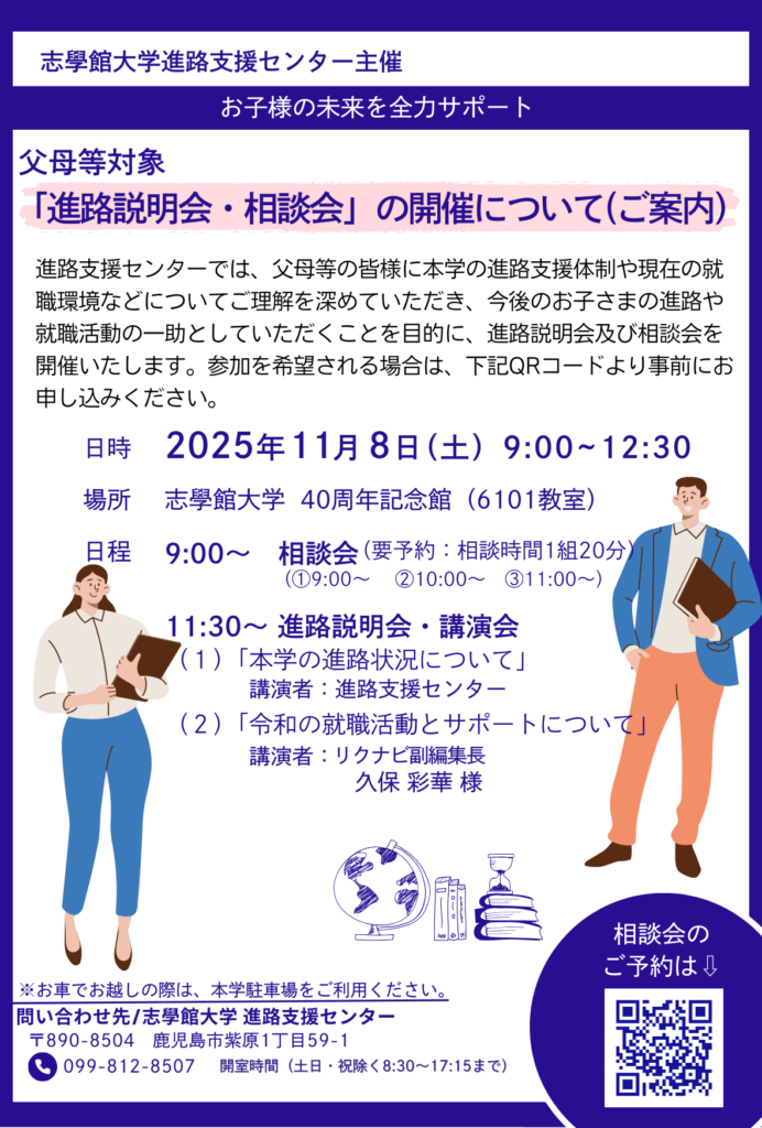 本学では、父母等の皆さまを対象にした 「進路説明会・相談会」 を開催いたします。