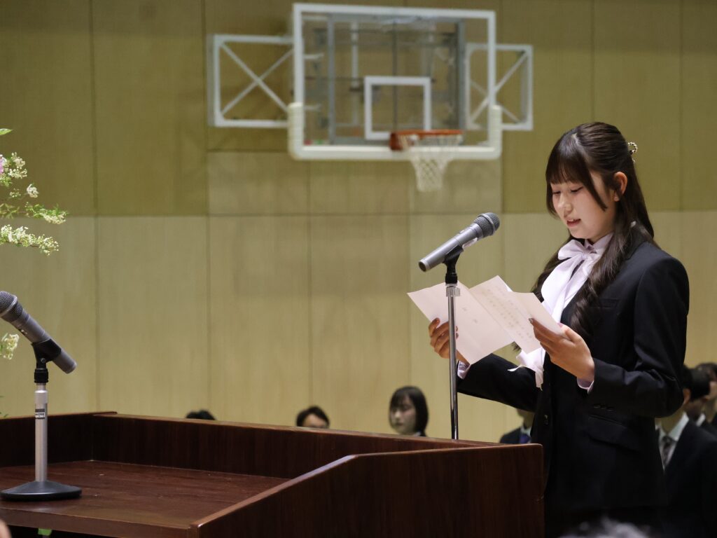 その後、新入生を代表して、人間関係学部の川畑佳乃さんから、「「時代に即応した 堅実にして有為な人間の育成」という志學館学園の建学の精神と「個性・実践・人間力」に要約される本学の教育目標を意識し、社会の期待にこたえる人間となるために努力します。」と力強い宣誓がありました。