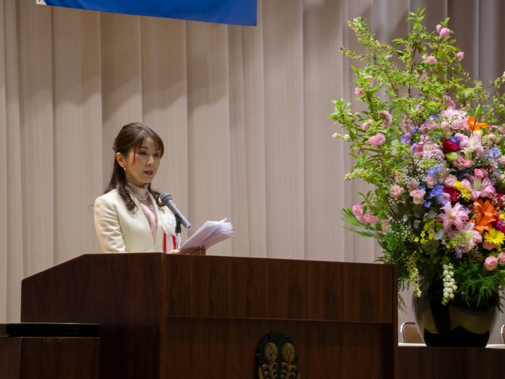入学許可宣言の後、飯干紀代子学長から、「サークル活動、アルバイト、ボランティア、旅行、留学など、様々な経験に思い切って挑戦してください。キャンパスにそれぞれの色を、形を、自由に描き、試行錯誤してください。私たち教職員は、皆さん一人ひとりの挑戦を支えます。」と式辞が述べられました。