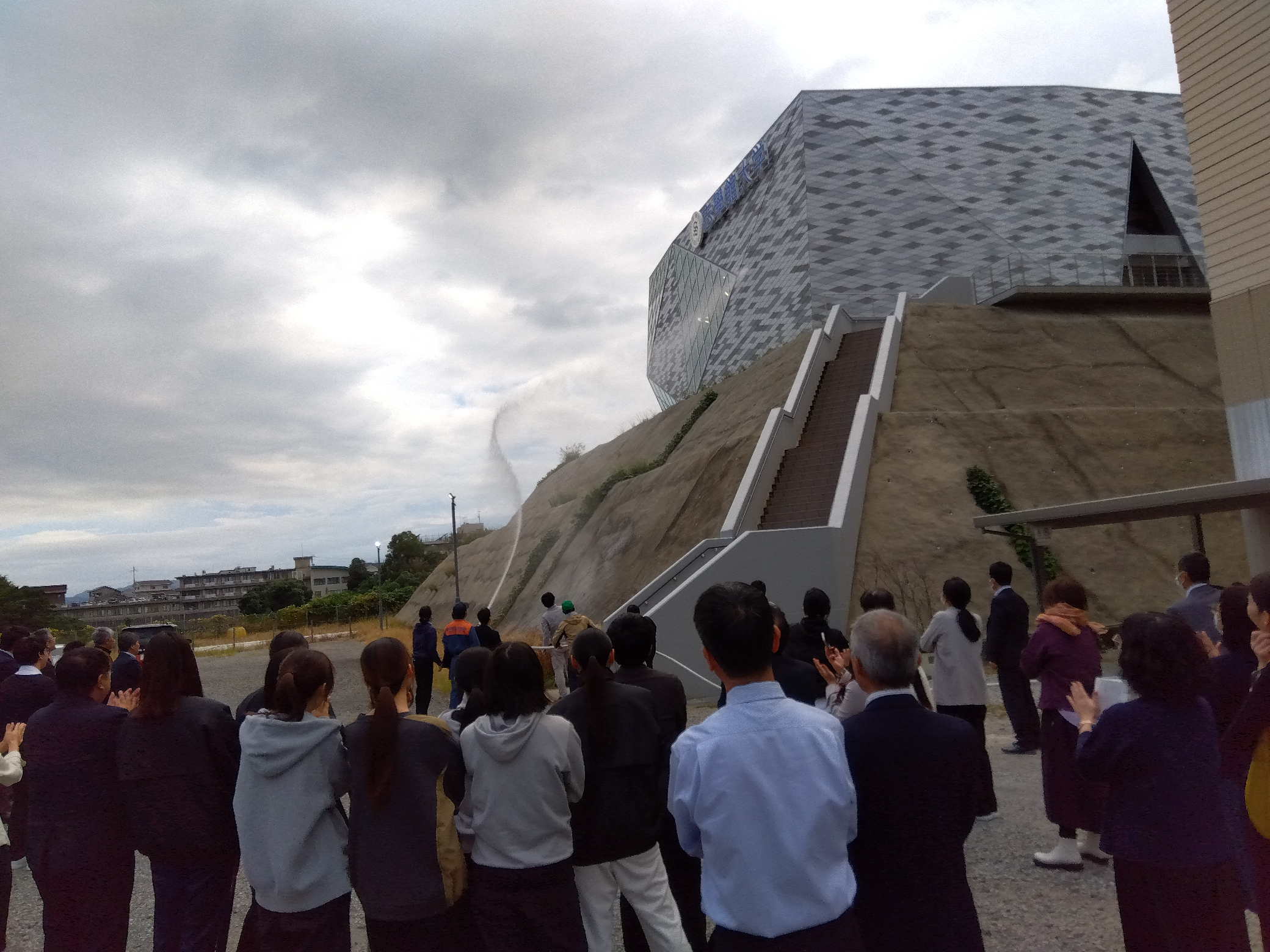 訓練後は、40周年記念館の裏側へ移動し、消防設備委託業者の指導の下、普段触れることがない「消化栓ホース」の操作訓練を学生、教職員が実際に放水して実施しました。