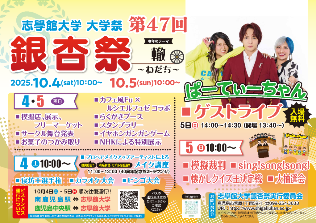 2025年10月4日(土)・5日(日)に、第47回「銀杏祭~轍~」を開催します。今年のゲストは「ぱーてぃーちゃん」さんに決まりました。両日ステージ発表や模擬店が行われます。桜島と錦江湾、鹿児島市街地を一望しながら最高の時間をお楽しみください。皆様のご来場を心よりお待ちしております!